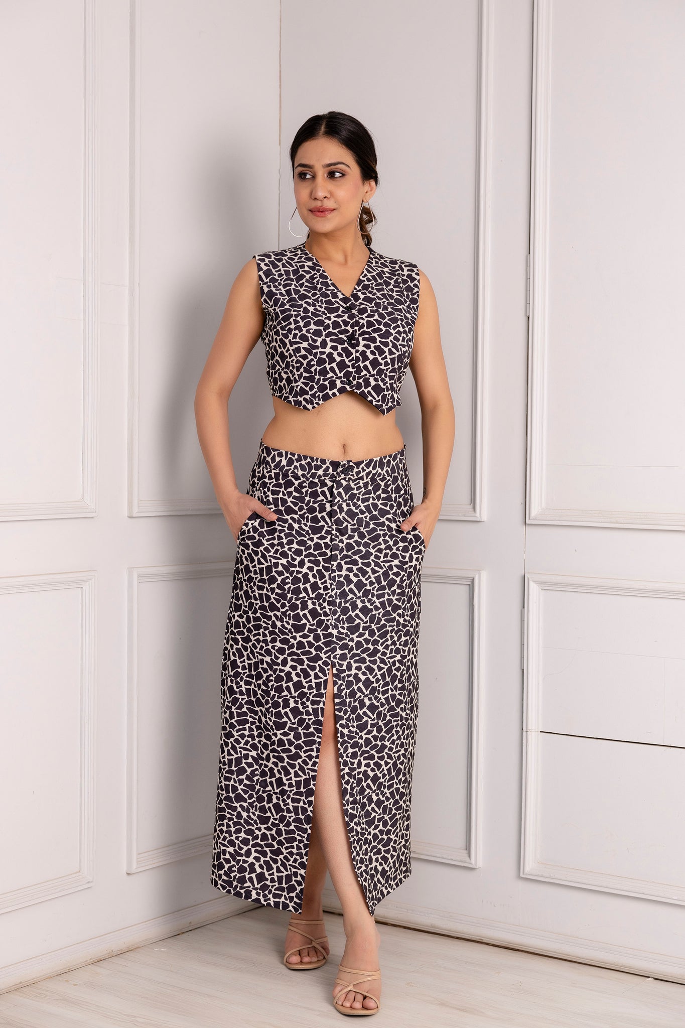 Make a statement with this contemporary two-piece ensemble featuring a striking blue and white abstract print. The fitted crop top offers a modern silhouette that pairs seamlessly with the flowing midi skirt, creating versatile styling options for casual outings or elevated occasions. The coordinated print design ensures effortless color harmony, while the combination of fitted and relaxed proportions delivers balanced proportions. Perfect for those seeking sophisticated ethnic-inspired pieces with contemporary appeal.
