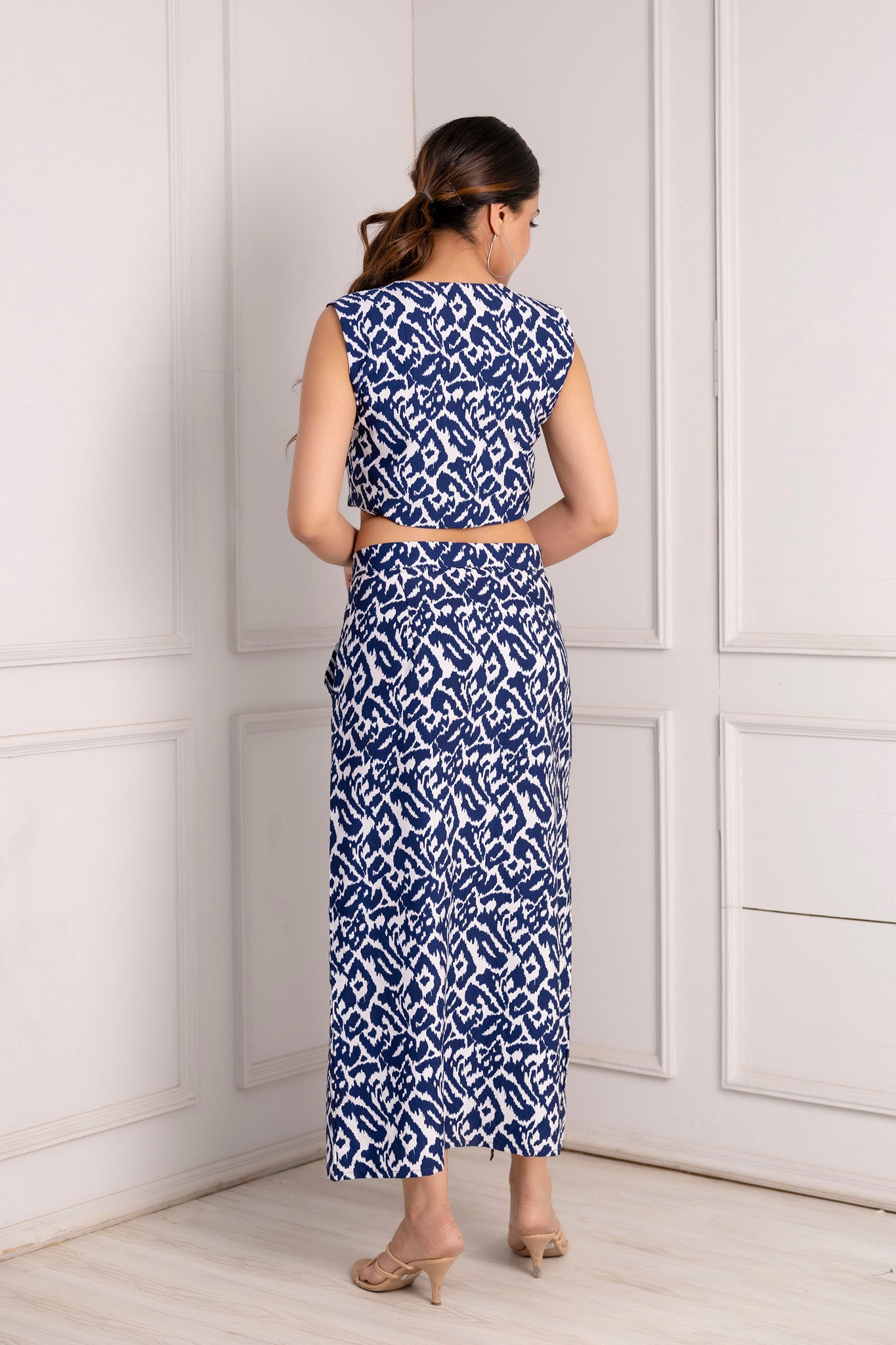 Make a statement with this contemporary two-piece ensemble featuring a striking blue and white abstract print. The fitted crop top offers a modern silhouette that pairs seamlessly with the flowing midi skirt, creating versatile styling options for casual outings or elevated occasions. The coordinated print design ensures effortless color harmony, while the combination of fitted and relaxed proportions delivers balanced proportions. Perfect for those seeking sophisticated ethnic-inspired pieces with contemporary appeal.