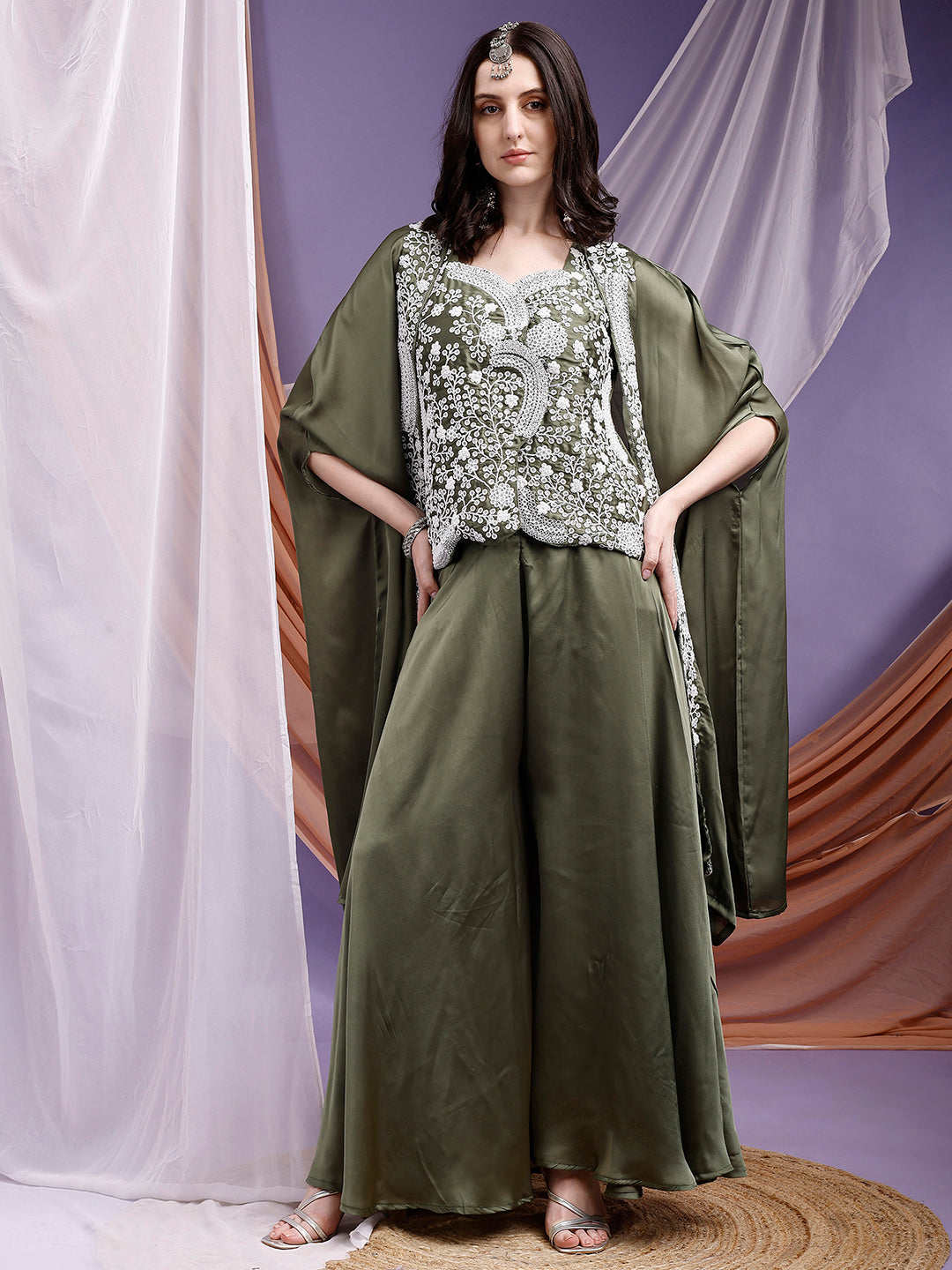 Designer Embroidered Wine Palazzos Set with Jacket Elevate your celebration wardrobe with this exquisite designer ensemble, crafted for the discerning guest. The rich wine hue provides a sophisticated backdrop for intricate embroidery work that showcases masterful artisanal detail. This three-piece set combines a beautifully embellished jacket with coordinating palazzo pants, delivering the refined elegance demanded by premium wedding and festive occasions. The flowing silhouette of the palazzos ensures graceful movement, while the structured jacket adds architectural polish. Perfect for those who appreciate exclusive, statement-making pieces that reflect both heritage craftsmanship and contemporary design sensibilities. An investment in timeless ethnic luxury.