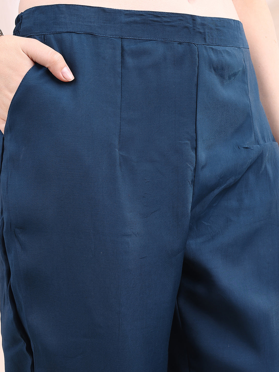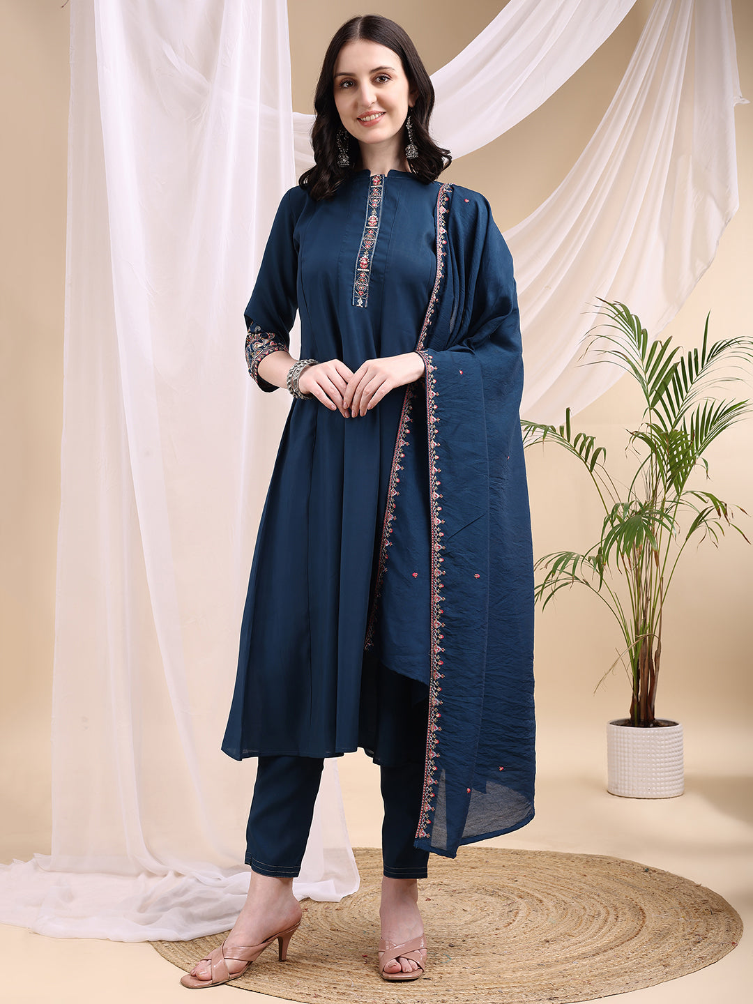 Elevate your ethnic wardrobe with this timeless three-piece ensemble. Crafted from pure cotton for breathability and comfort, the kurta features intricate ethnic motifs embroidered across the chest and neckline, showcasing traditional craftsmanship. The V-neck silhouette offers a flattering, contemporary cut while maintaining classic appeal. Paired with coordinating trousers for a polished fit and a flowing dupatta to complete the look, this set is ideal for festive occasions, cultural celebrations, or everyday elegance. Perfect for those who appreciate authentic ethnic fashion with quality construction.