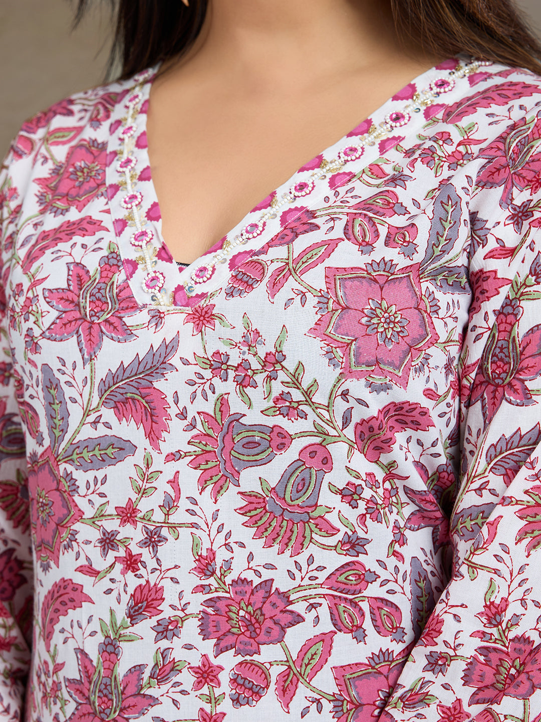 Embrace vibrant comfort with this gorgeous two-piece ethnic set, tailored from 100% pure, breathable cotton. This set features a refreshing white base adorned with a lively blush pink and magenta floral print, offering a perfect blend of elegance and cheerfulness.